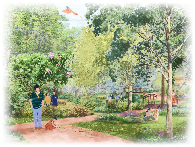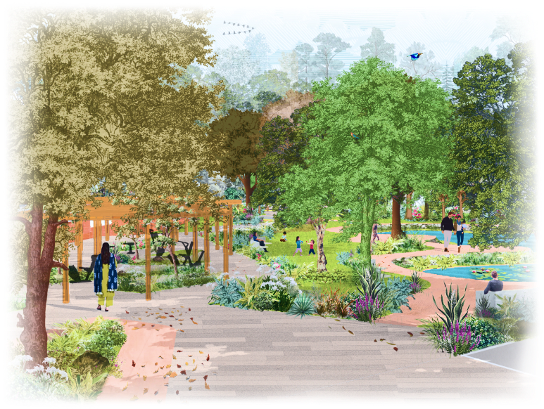 Terraced lawns for play and picnics with shaded pavilions under canopies. Amphitheatre steps host cultural gatherings within the living rhythm of wetlands.