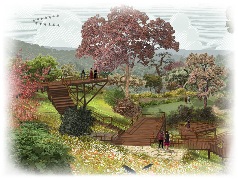 Hill staging ground with hiking trails, rock walls, camping, and viewing decks. Forested lawns and reading shelters balance rugged adventure with quiet wonder.
